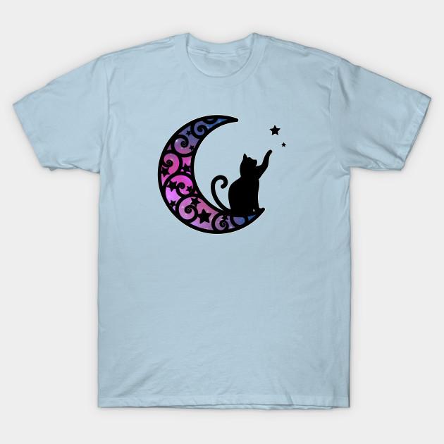 Men Black Print T-shirt Starlight Moon Kitty Cat Silhouette No-Cut Transfer Paper Print Cotton Tshirt