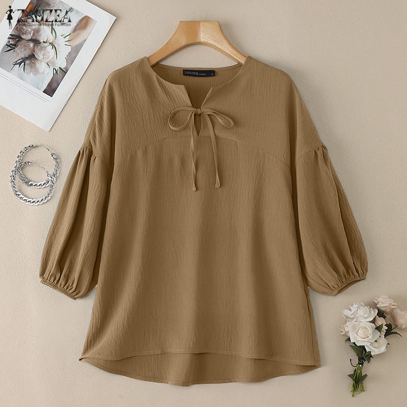 ZANZEA Women Casual Round Neck Solid Color 3/4 Sleeve Loose Blouse