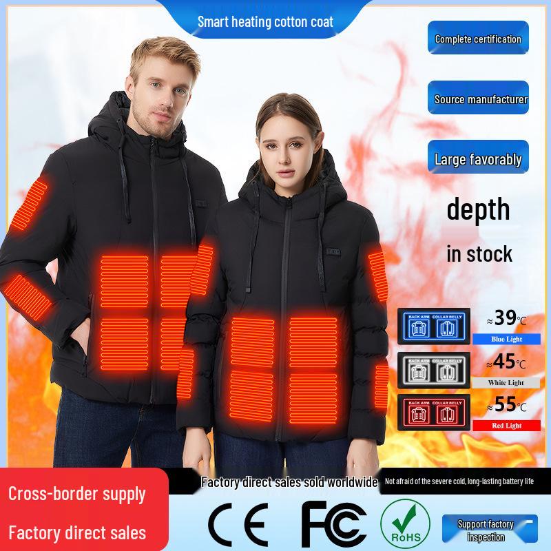 Upplev oöverträffad värme och komfort med denna uppvärmda vinterjacka med huva för män. Denna jacka är designad för det kallaste vädret och har intelligent konstant temperaturteknik för att enkelt upprätthålla optimal värme.. Dess exteriör är tillverkad av högkvalitativt polyestermaterial, vilket säkerställer hållbarhet och skydd mot väder och vind.. Den tjocka bomullsrocken är fodrad med mjuk polyesterfiberpäls, vilket ger ett extra lager av isolering och komfort.. Håll dig varm och snygg under vinteräventyren med denna innovativa uppvärmda jacka.