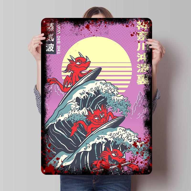 Surfing Dragons Great Wave Poster Customized Wall Art Vintage Metal Signs Retro Tin Plaque for Man Cave Decoration Gaming House