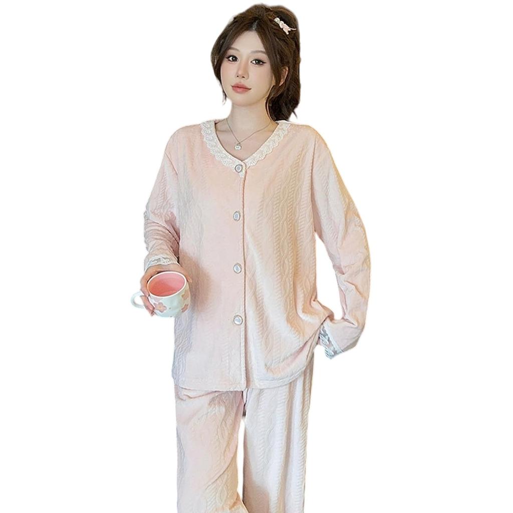 YunXiozy Star Winter Long Sleeve Fluffy Island Flannel Loungewear Set with Open Front and Cute Lace Warm and Comfortable Women's Pajamas, V-Neck,