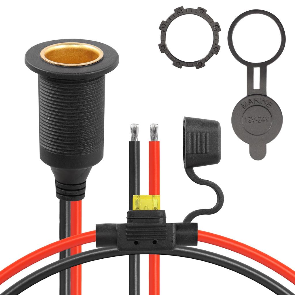 CERRXIAN /24V Fixed Thread Cigarette Lighter Socket Extension Cable, 20A 13AWG Waterproof Cigarette Igniter Female Socket Replacement Cable (0.3M)