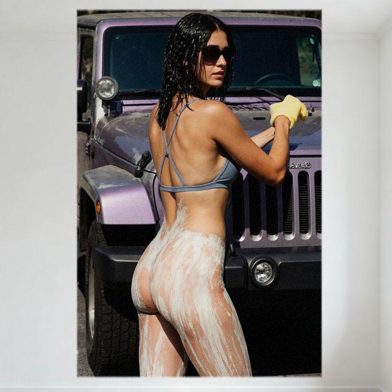 Sexy Woman Wet Dark Curly Hair Bikini Car Wash Scene Purple Jeep Wrangler Metal Tin Sign for Home Bar Wall Decor Vintage Metal P