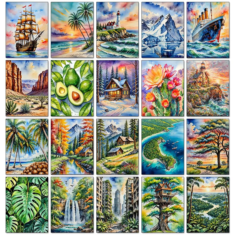 Akvarelllandskap Växtserie Diamantkonstmålning Dekoration Segelbåt Diy Full Strassmosaik Korsstygnsats Gåva