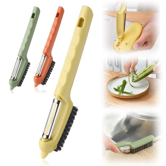 Denna mångsidiga grönsaksskalare kombinerar en vass, ergonomisk skalningskniv med en tät, tålig rengöringsborste för effektiv köksanvändning.. Det mycket vassa bladet säkerställer tunn, jämn skalning medan det bekväma, halkfria handtaget ger säkerhet och användarvänlighet.. Designen med dubbla funktioner gör att du enkelt kan skala frukt och grönsaker och rengöra skärbrädor eller knivrester med den integrerade borsten, vilket sparar plats och tid..