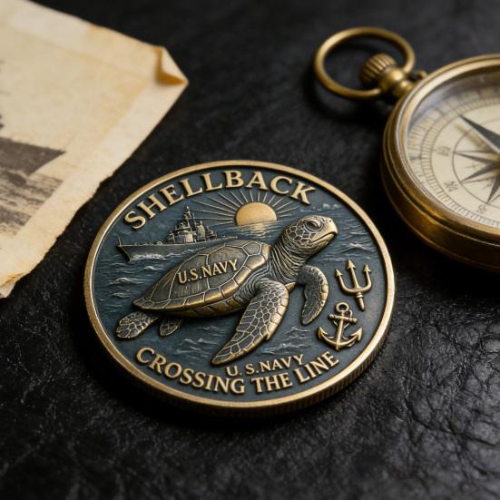 Meningsfulla textinskriptioner: Myntet har exakta gravyrer inklusive "SHELLBACK" högst upp, "CROSSING THE LINE" längst ner och "US. "Marinen" centralt placerad. Dessa inskriptioner förmedlar tydligt den centrala betydelsen av den traditionella sjöceremonin som hedrar sjömän som har korsat ekvatorn.