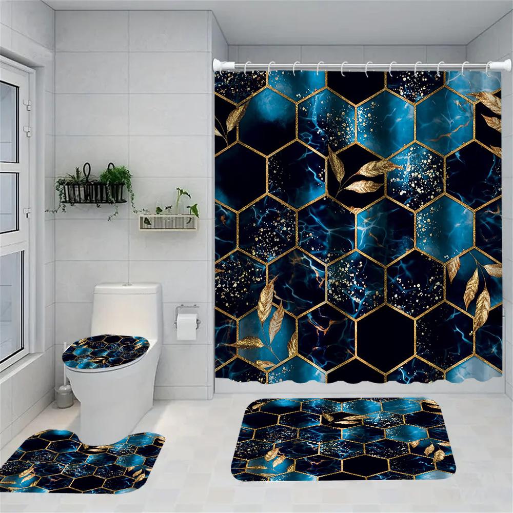 1/4 Geometriskt rutnät duschdraperier, Toalettsitsdekoration, Duschdraperi med matta och toalettlock, 12 70.8x70.8 tum krokar