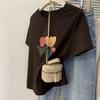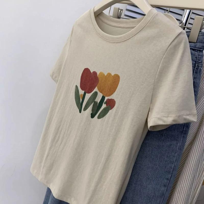 Khakifärgad Kortärmad Dam Sommar Ny Koreansk Lös Mångsidig Mode Blommönstrad Bomulls T-shirt Topp