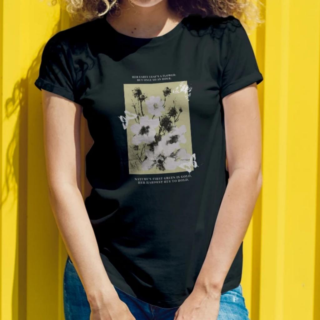 Konstnärlig Dam T-shirt Kort Ärm Naturdikt Design med Blomillustration och Litterärt Citat Grafik för en Elegant Look