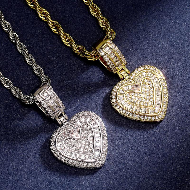 Gold Color Iced Out Heart Pendant Necklace For Men AAA+ Cubic Zirconia Stainless Steel Rope Chain hip-hop women's Accessories