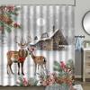 unframed Christmas Shower Curtain, Winter Farm Barn Snowman Animal Moose Berry Christmas Tree Snow Scene Red Bird Bathroom Dec