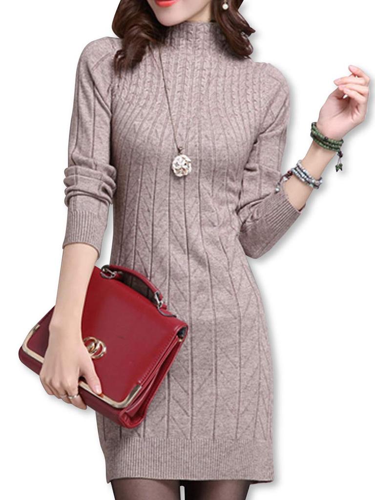 Rentamente Knit Long High One Size Fits Most Women's Dress, Sleeve, Neck, Mini, (Beige)