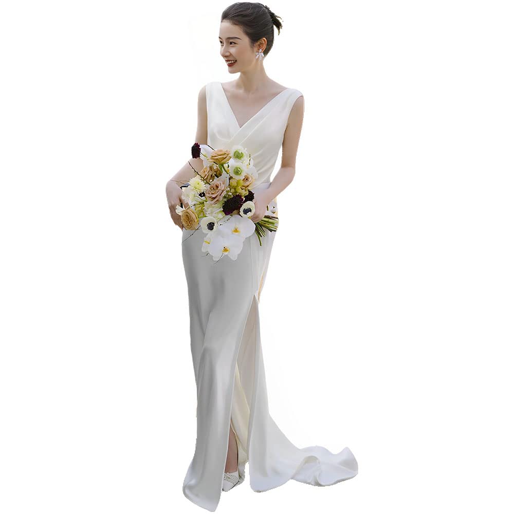 Simple, elegant, high-quality dress with a train and V-neck, perfect for weddings, receptions, after-parties, thank-you parties, dinners, coming-of-age ceremonies, reunions, girls' nights, dates, and recitals.