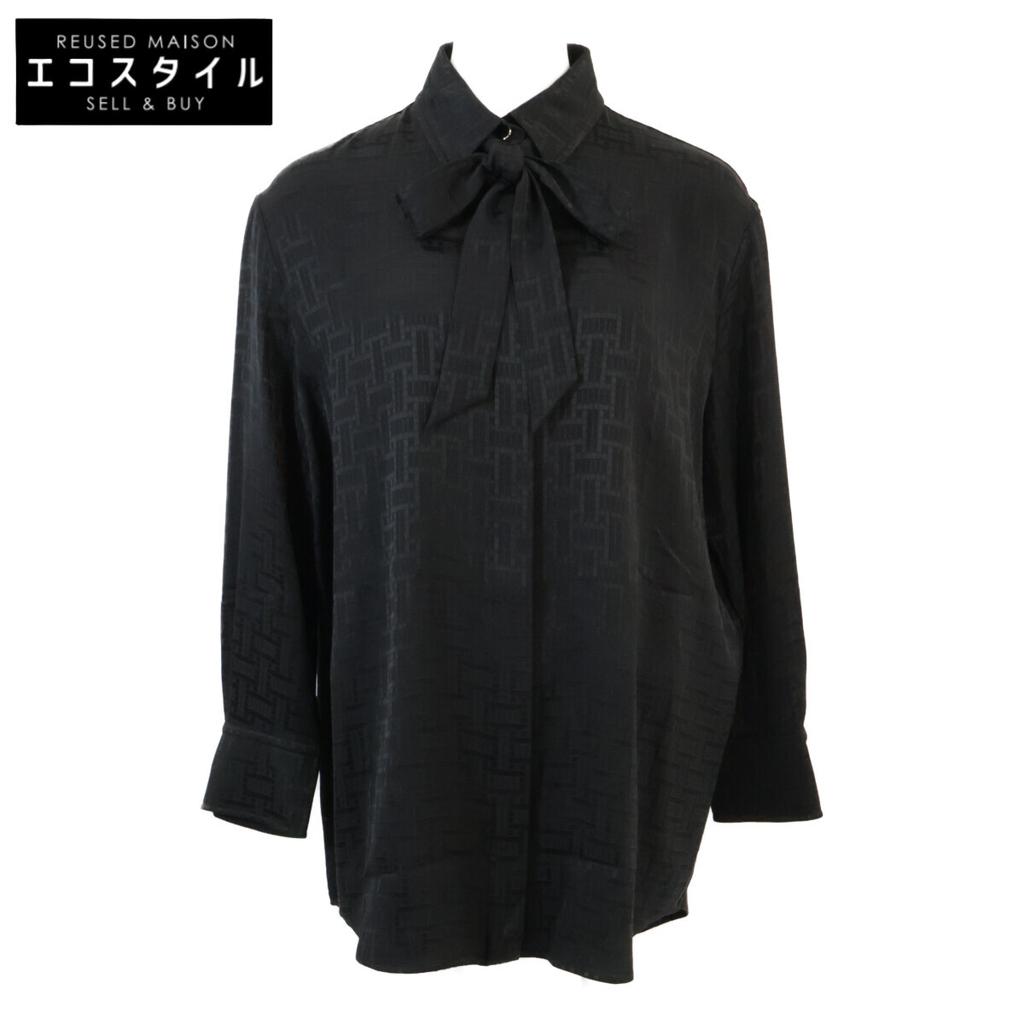 HERMES [Excellent Condition/Domestically Manufactured/24 Stainless Steel] 4E0603DC Mosaic Bowtie Collar Silk Long Sleeve Shirt tops 36 blackUsed
