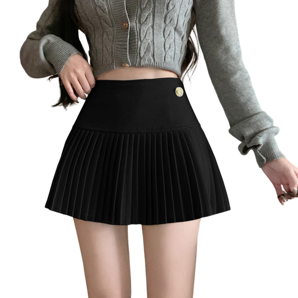 Syvent Black Pleated Mini Mini Solid High Sizes 12F001 Skirt, A-Line, Length, Color, Waist, Cute, Casual, S, M, L, XL, Women's, Spring, Summer,