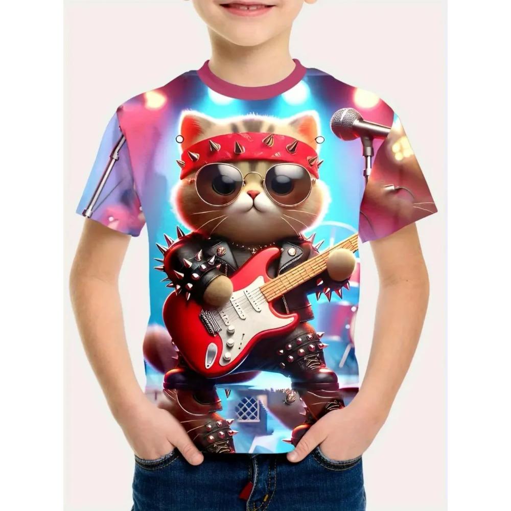 Hip Hop Cat Boys T-Shirt Cute 3D Print Summer Short Sleeve Round Neck Casual Kid Top Comfortable Soft Breathable T-shirt