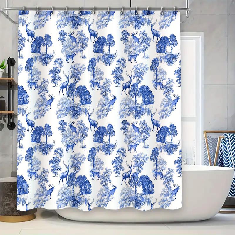 Hjort Skog Duschdraperi Vintage Blå Botanisk Natur Tematisk Bakgrund Tvättrum Dekor Gård Rustika Badrumstillbehör