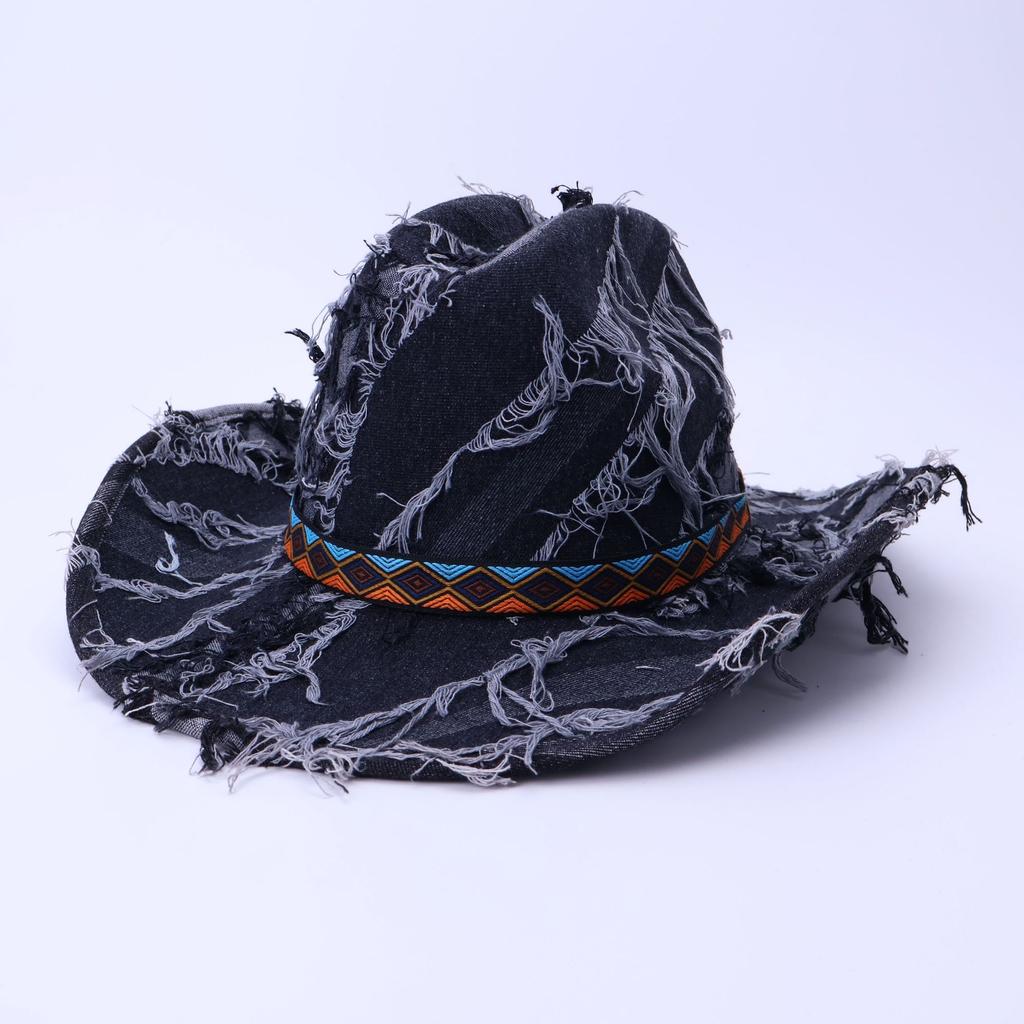 Denim One-Word Top Top Top Hat Jazz Hat Ripped Retro Western Cowboy Hat