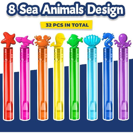 【Super Value Pack】Bubble Soap Liquid set of 32pcs mini bubble wands, 8 cute sea animal's theme designs (Starfish, Shark, Seahorse, Octopus, Crab, Dolphin, Fish, Shell), 8 Vibrant Rainbow Colors, As party supplies reunion fun for kids, perfect bubble party favors for kids, boys, girls, toddlers, birthday party favors, birthday gift, outdoor activity, school event, game prize, goodies bags, game prize, beach toys or indoor bath time entertainment.