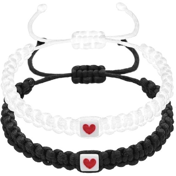 Caiyao 2Pcs Handmade Pinky Promise Heart Braided Bracelets Black White Love heart Matching Bracelets Adjustable Couples Friendships Long Distance