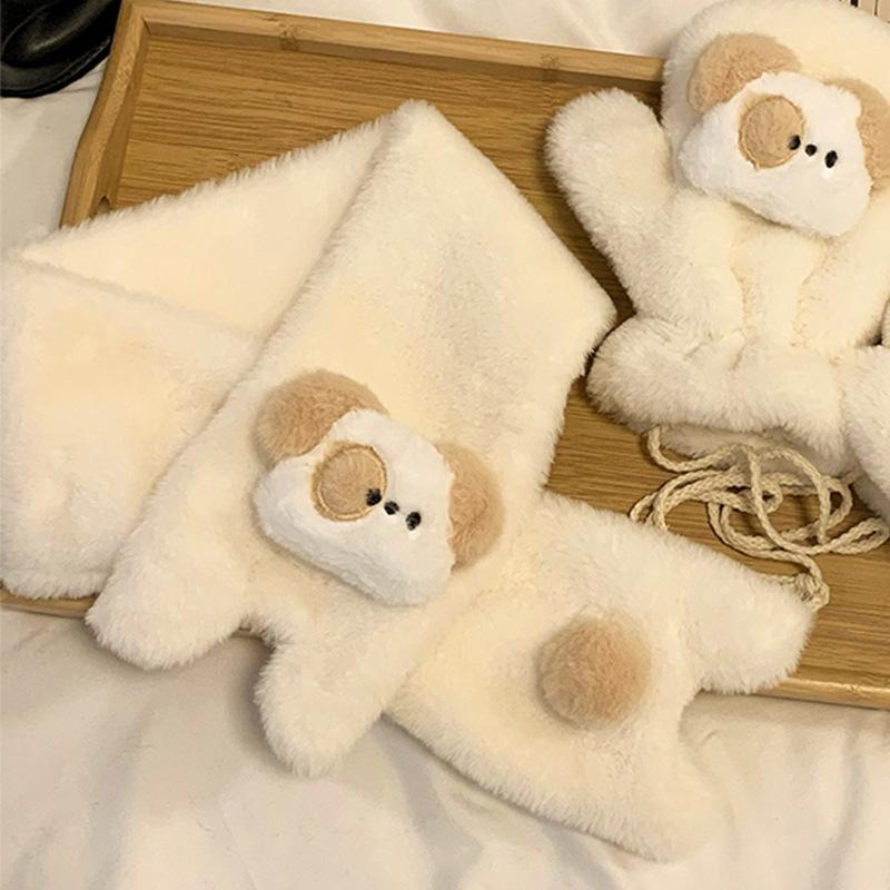 Warm fluffy plush gloves scarf two-piece set thickened cold-proof artifact cute puppy gloves