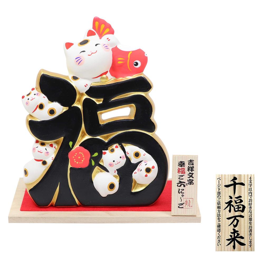 Osaka Choseido Figurine with Auspicious Characters Cute Ceramic Good Luck Includes Original Wooden Tag Maneki-neko (Goroku Nyago) - Charm,