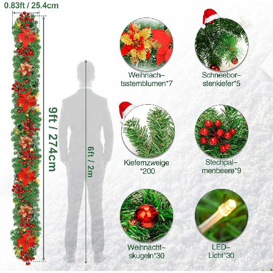 Christmas Garland,Christmas Garland with Lights,Xmas Decor,9 ft Rattan Artificial Flower Vine Plants Xmas Decorations for Indoor Outdoor Home Mantel
