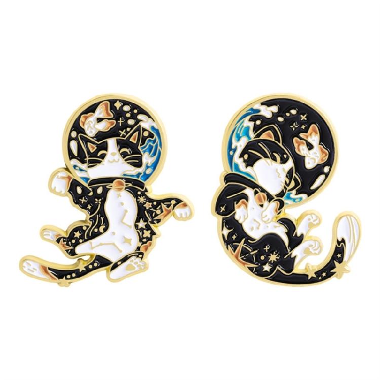 Denna eleganta emaljerade nål kombinerar en finurlig tecknad astronautkatt med motiv av universums stjärnbilder, vilket skapar en unik fusion av lekfull design och kosmisk inspiration, perfekt för kattälskare och smyckesentusiaster.
