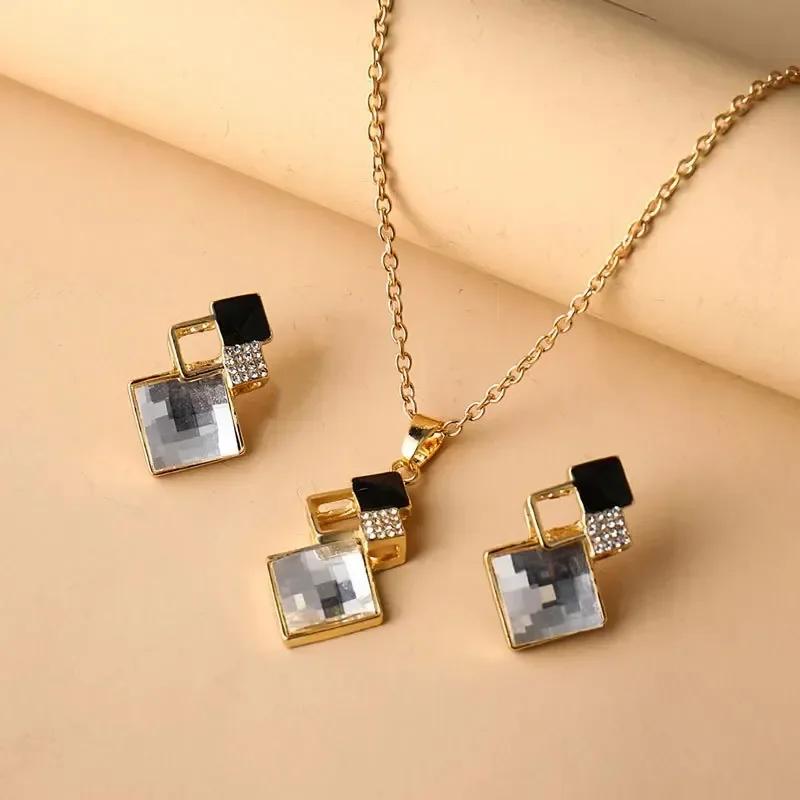 Mode Kreativ Dekoration Koreansk Minimalistisk Fyrkantig Diamant Inlagd Halsband Örhängen Set Nyckelbenskedja Tillbehör Gåvor