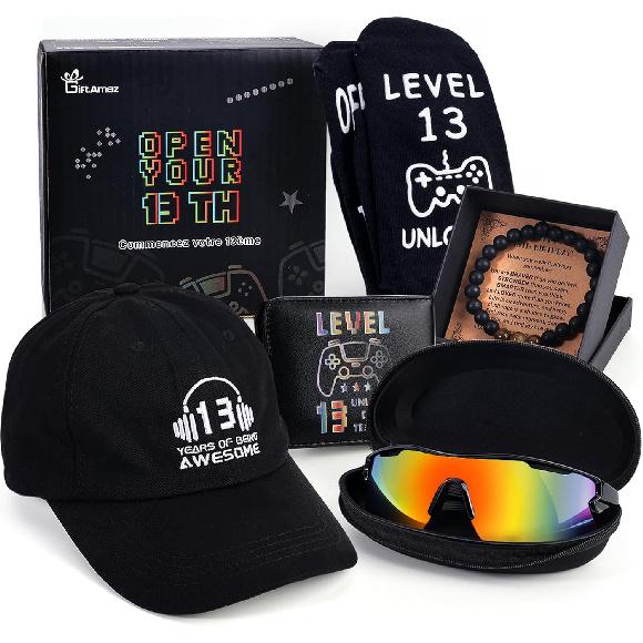 All-in-One Gift Set for Boys: Our gift box includes a range of cool and practical items: an adjustable cap, trendy sunglasses, a unique natural stone bracelet, a leather wallet, comfy cotton socks, and more. Each piece is thoughtfully curated to enhance any outfit and create a memorable birthday experience. Everything a 13-year-old boy needs to feel special on his big day.
