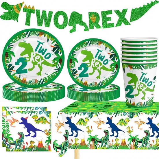 Dinosaur Birthday Decorations 2 year old Boy Plates Napkins and Cups Banners Table Cloth Three Rex Birthday Party Decorations for Boys Two Rex