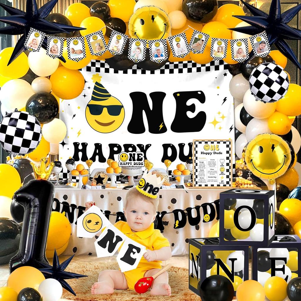 All -in One! One Happy Dude Birthday Decorations include:1 felt happy dude banner, 1 birthday crown, 1 cake topper, 1 high chair banner, 1 backdrop, 1 monthly photo banner, 1 milestone poster,1set balloons boxes, number 1 foil balloon, 2 s star burst foil balloons, 2 yellow foil balloons, 2 checker foil balloons, 90 latex balloons.