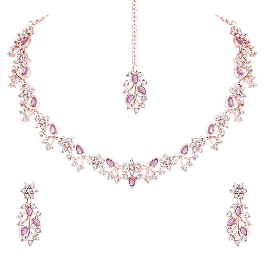 Contains : 1 Necklace + 1 Pair of Earring + 1 Maang Tikka; Color: Rose Gold Plated & Purple