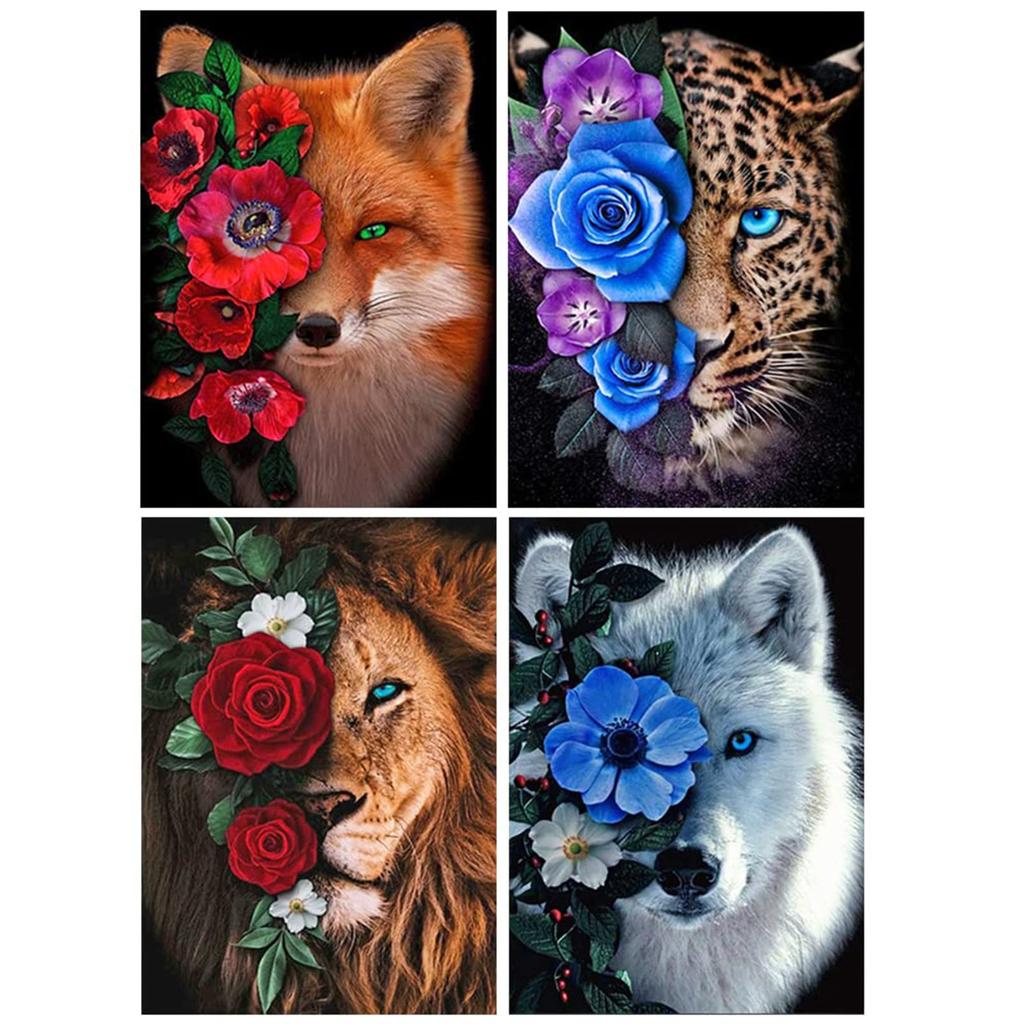 produktnamn: JISHSHAY 5D Diamantkonstkit - 4-pack Djur & Blommor (Tiger, Lejon, Varg, Räv)
