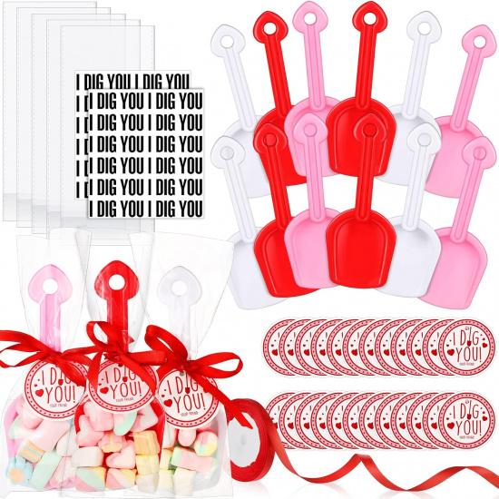Sweet Valentine's Day Set: the package comes with a total of 133 pieces, including 24 pieces of plastic shovels in 3 colors, namely red, white and pink, each color has 8 pieces, 36 pieces of transparent I DIG YOU stickers, 36 pieces of I DIG YOU round tags, 36 pieces of clear treat bags, and 1 roll of red ribbon, a total of 5 kinds of accessories, complete configuration