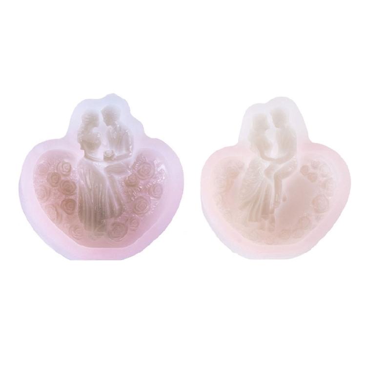 Enhancing your wedding decoration with this rose flower heart shaped silicone candle mold, embellished with bride and groom figurine, great for creating scented candle, soap, scented stone and cake top fondant decoration.