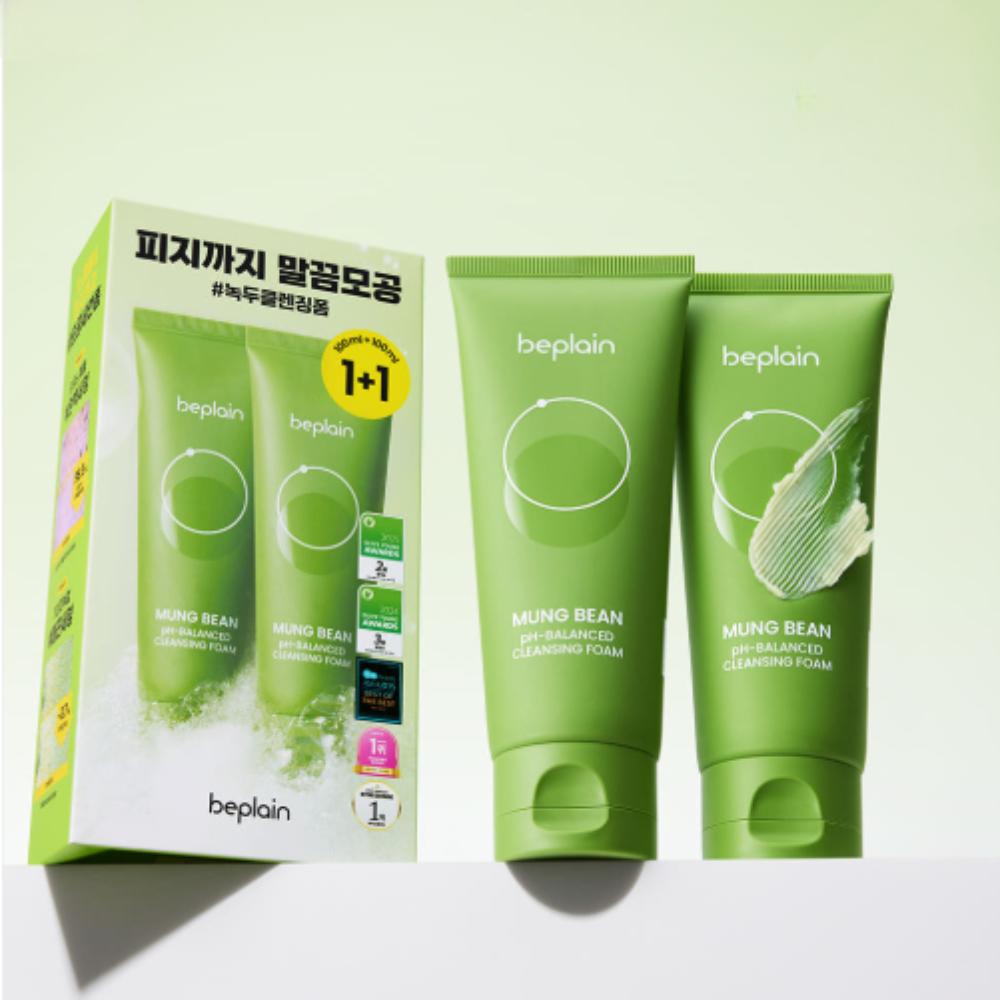 BEPLAIN mung bean cleansing foam, low pH facial cleanser, gentle daily cleanser set, sensitive skin foam cleanser, K-beauty low pH cleanser, mung bean face wash, 100ml cleanser 2pcs