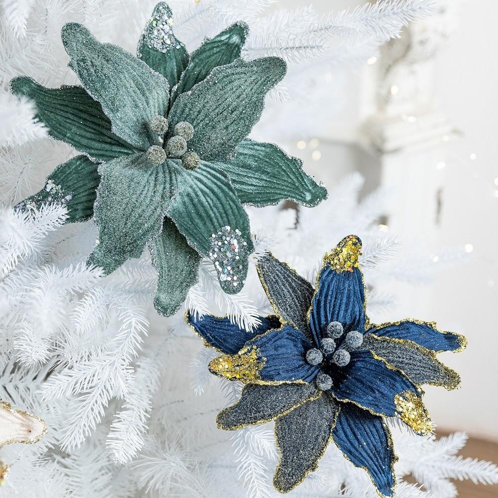 Faux Velvet Artificial Christmas Flower with Glitter Vibrant Color Poinsettia Flower Decor 26cm DIY Christmas Tree Wreath