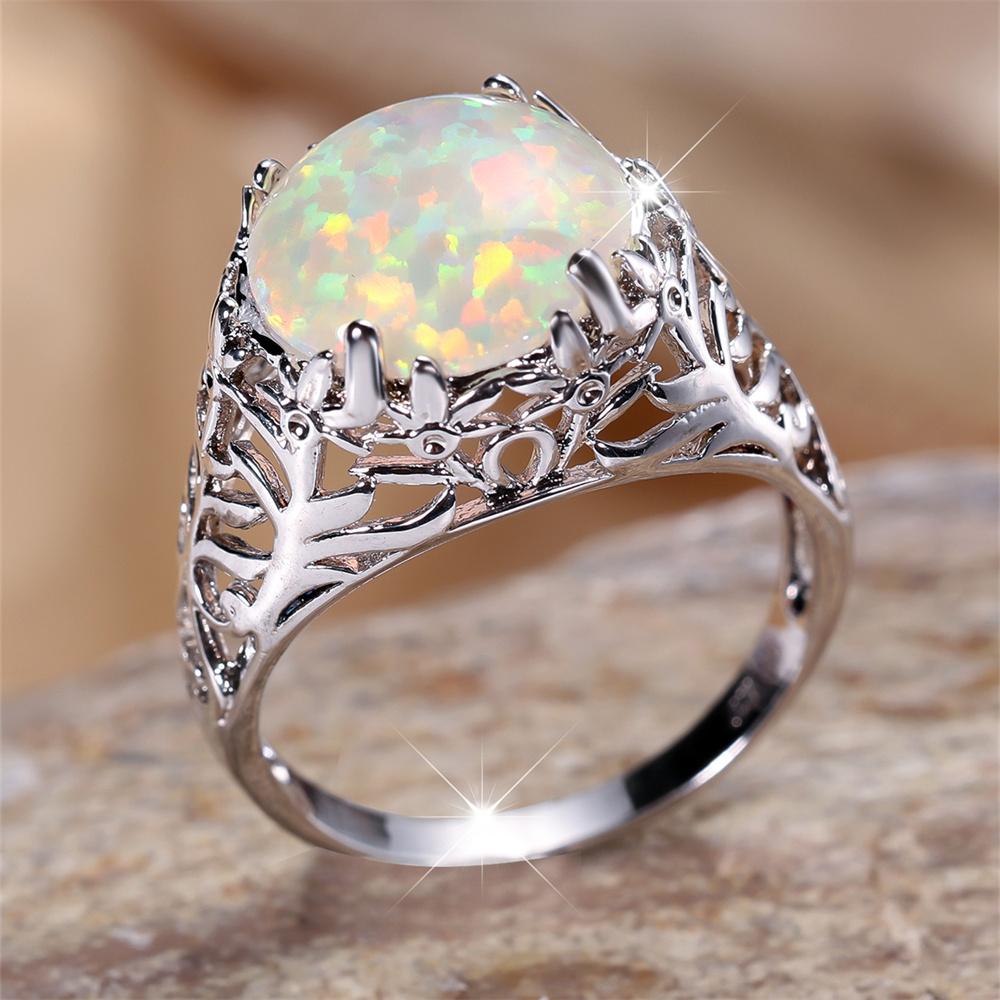 White Fire Opal Big Round Stone Vintage Hollow Rings For Women Fashion Silver Color Engagement Bands Christmas Gifts
