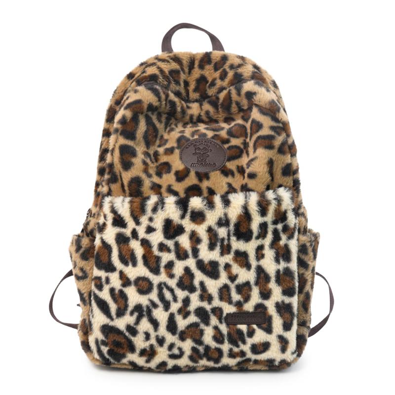 Plyschryggsäck med leopardmönster för kvinnor – Söt & mysig pälsklädd skolväska – Perfekt för vintermode & fritidsbruk