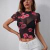 Summer New Net Fabric Flower Print Earflap Short-sleeved T-shirt Slimming Top for Women