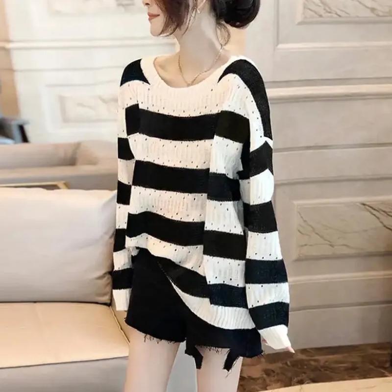 Western Style Hollow Knitted Sweater Summer Thin and Lightweight Summer Striped Sweater Tops for Women