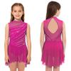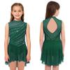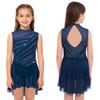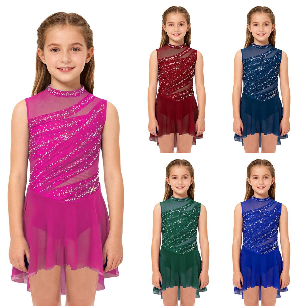 Barnklänning för dans, ärmlös, med genomskinligt nät och strass, öppen rygg, rynkad, hög-låg fåll, kostym för lyrisk uppvisning