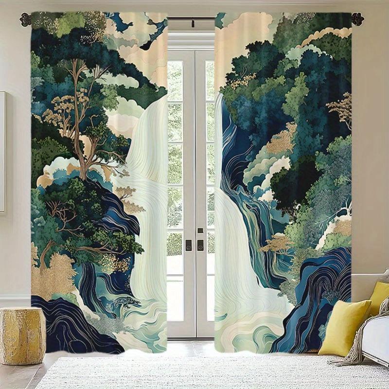 2PCS East Asian Landscape Sheer Curtains – Green Mountain Tree Print Rod Pocket Polyester for Living Room Bedroom Dining