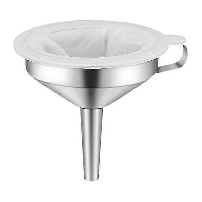 1. Stainless steel funnel for kitchen: 5 inches diameter, 4.21 inches tall, 1.77 inches long stem ; 5.9 inches diameter, 4.3 inches tall. Features stainless steel strainerfilter and 200 mesh food filter strainer, which can meet your different needs.