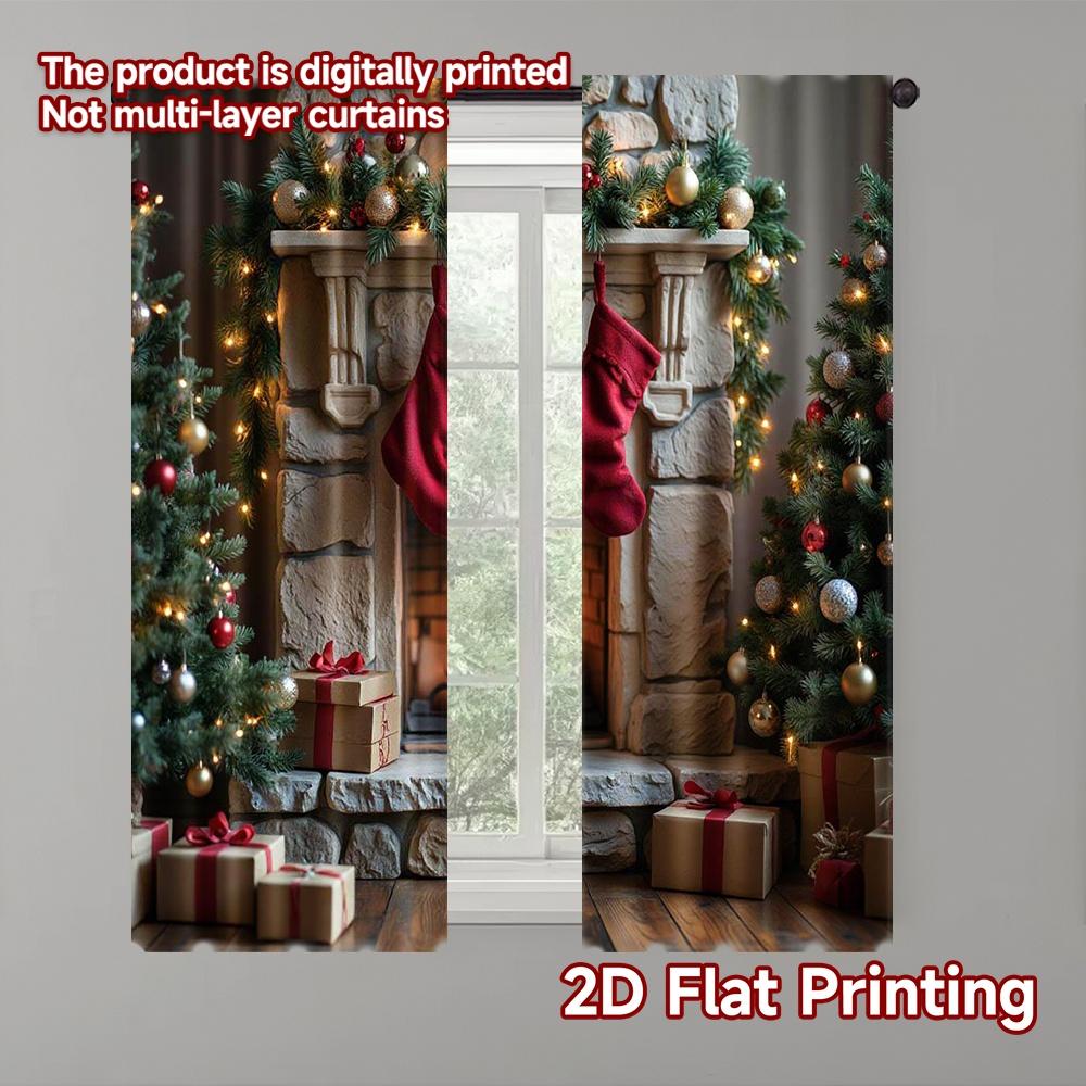 2pcs 2D flat printing Merry Christmas Window Curtains Day Christmas Fireplace Scene11 Machine Washable Polyester Without