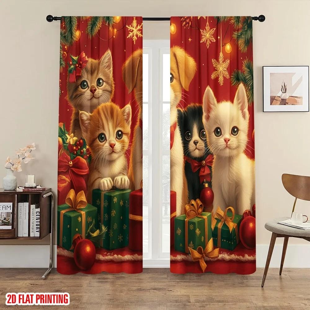 2pcs Cute Kitten Pattern Curtain Design Window Drapes Polyester Fabric Christmas Holiday Window Decoration Home Decor Rod P