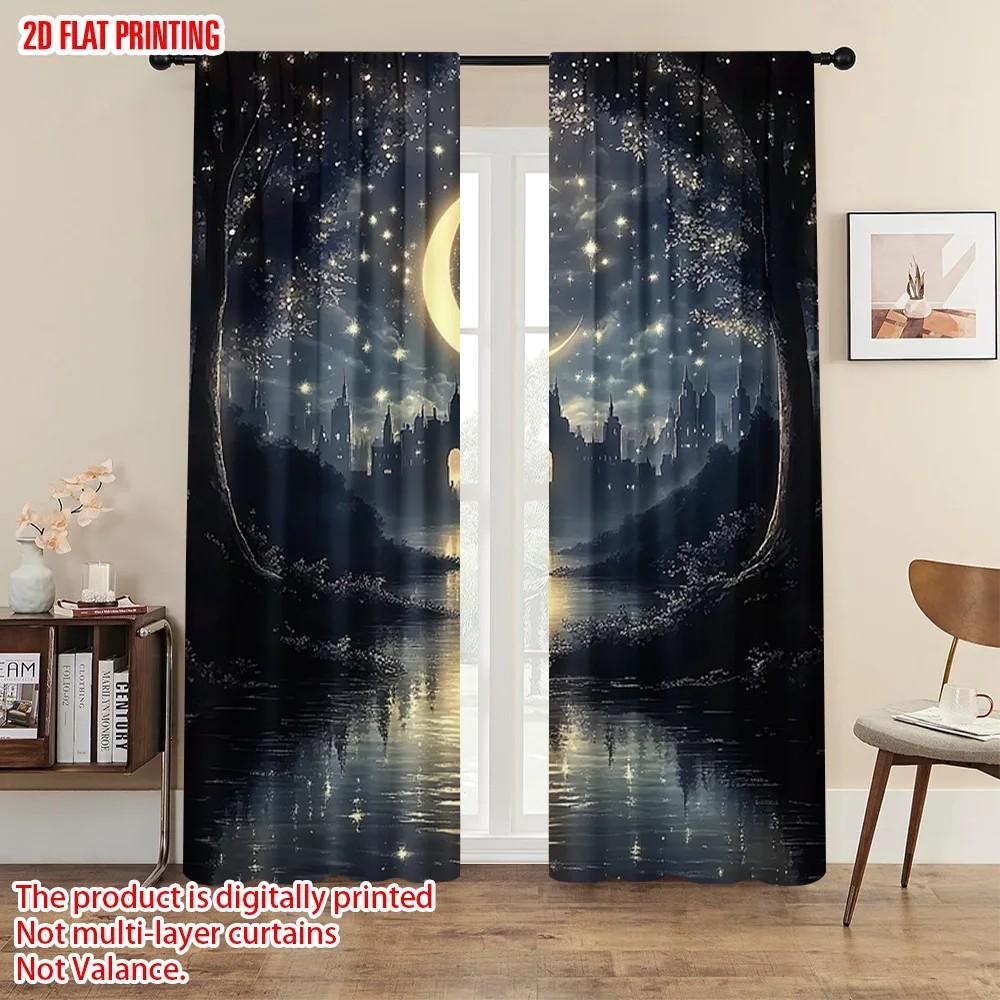 2pcs Mystical Moonlight Scene Curtains Polyester Window Treatment Home Decor Rod Pocket Curtains