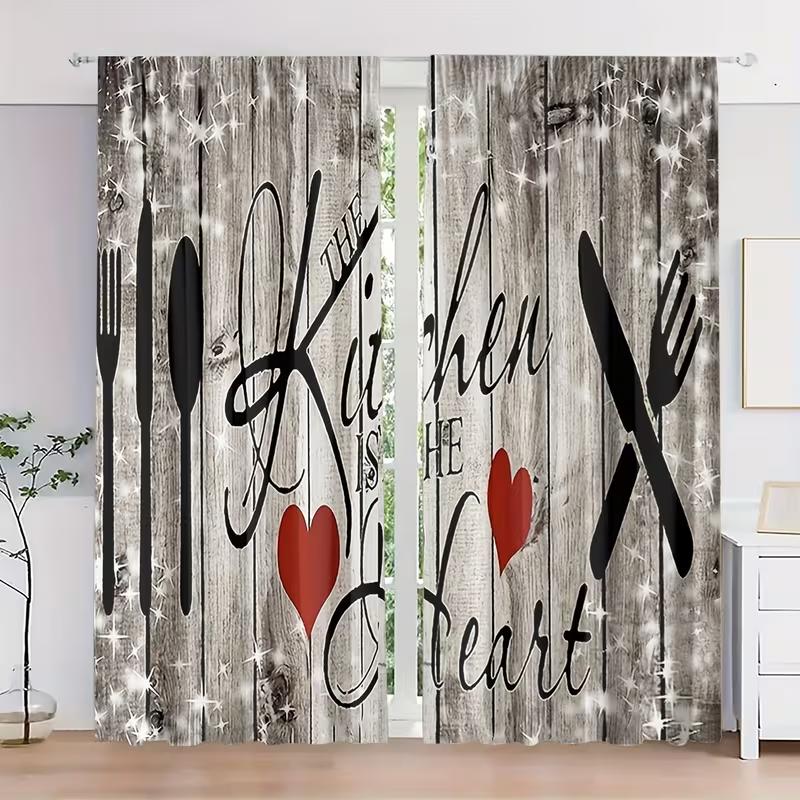2pcs Kitchen Utensil & Wooden Patterned Curtains Design for Kitchen Window Decoration Rod Pocket Curtains