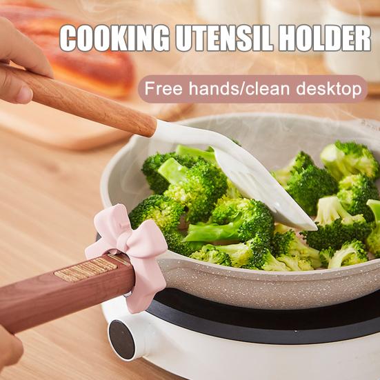 Håll köket snyggt och matlagningen organiserad med denna charmiga silikonspatelhållare med rosett. Designad för att klämmas fast säkert på de flesta kastrullhandtag, från små såskastruller till stora buljonggrytor. Den håller skedar, stekspadar, slev och andra redskap precis där du lagar mat, vilket förhindrar kladdiga droppar på bänkskivorna.